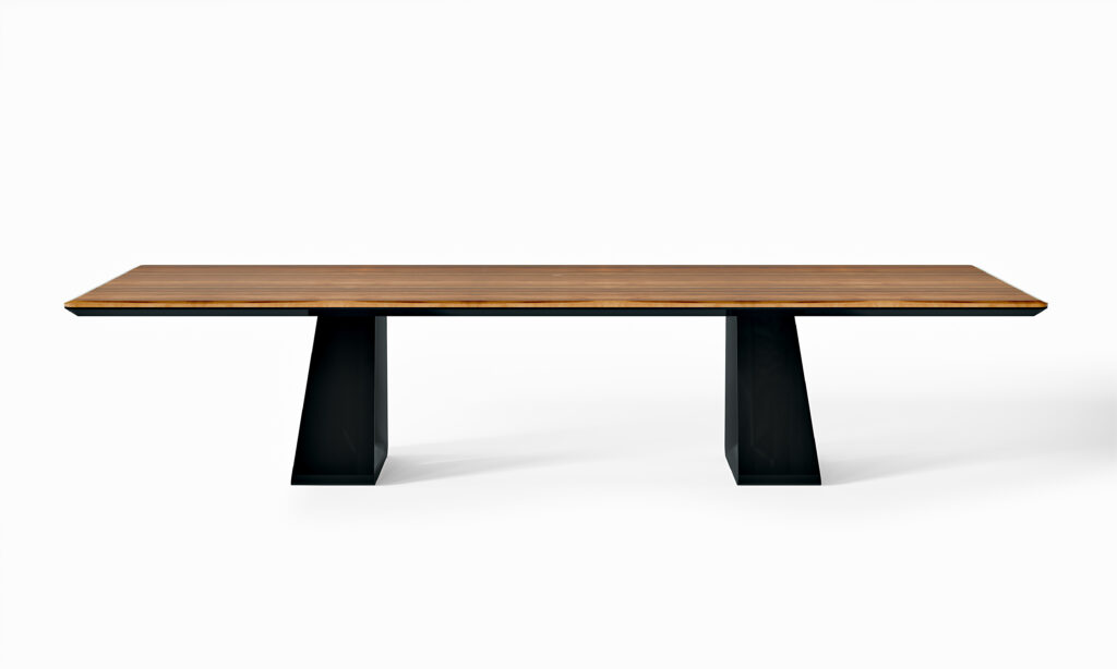 The Fenton table, a synthesis of sculptural power and refined graphic variations. The dual base unfolds through a sophisticated interplay of subtractions and chamfers, enhancing the aerodynamic effect. The...