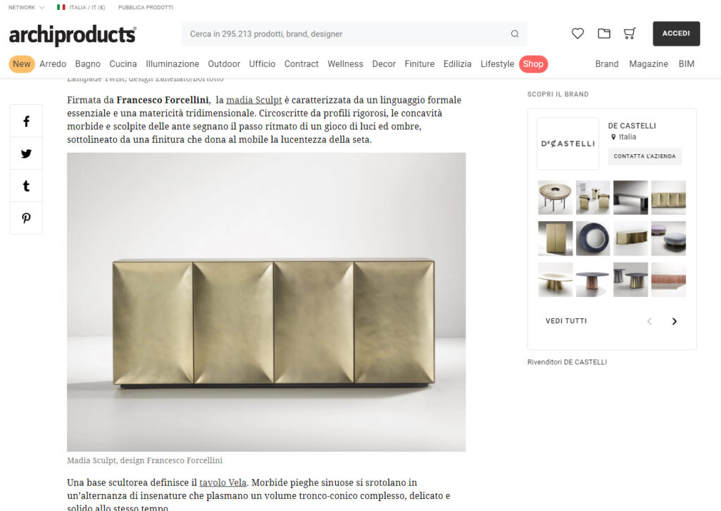 Nel 2022 la madia Sculpt, disegnata perDe Castelli, ha vinto l’ Archiproducts Design Award nella categoria arredo.