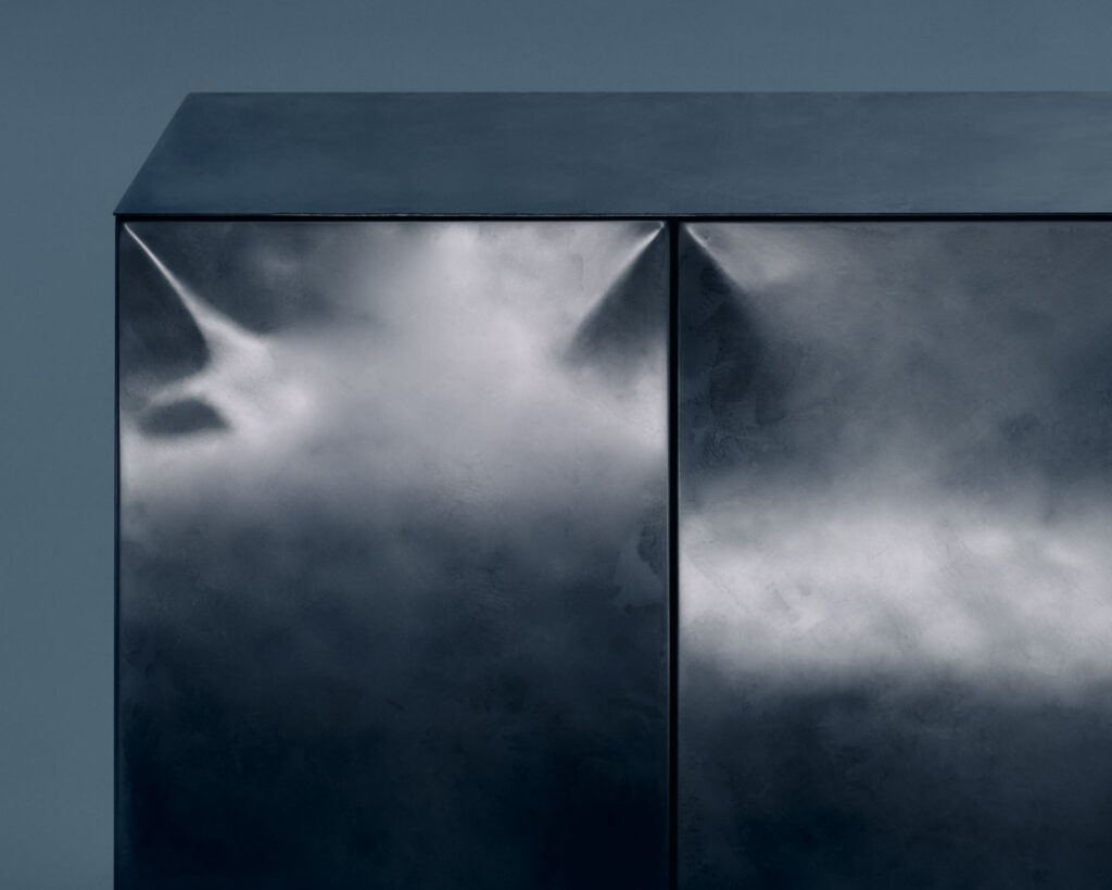 Sculpt è stata riproposta, insieme a una selezione di pezzi iconici del brand, nella nuova finitura De Iridium; la finitura in acciaio inox mette in dialogo sinergico la pura riflessione con le potenzialità dell’ossidazione. Sculpt è stata presentata nella sua prima versione nel 2022 e nello stesso anno ha vinto il premio Archiproducts. Proprio come la pietra può essere scolpita da un abile scalpellino, le tecniche di martellatura e smussatura possono plasmare il metallo in forme sinuose e organiche. Delimitate da bordi netti, le concavità morbide ma ben scolpite delle ante scandiscono il ritmo di luci e ombre che giocano sulla superficie, sottolineate da una sorprendente finitura martellata che conferisce al mobile l’eleganza e la lucentezza della seta.