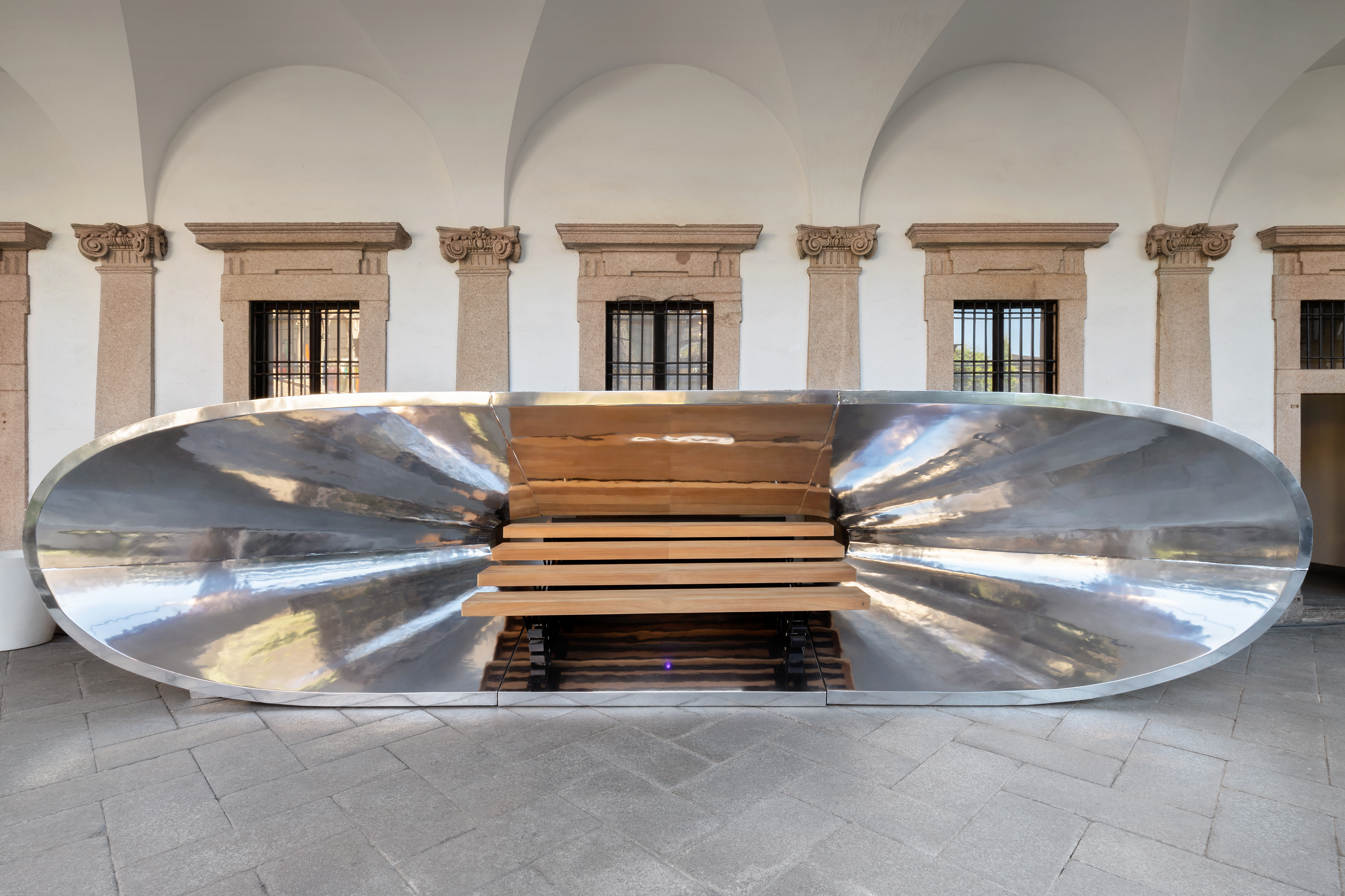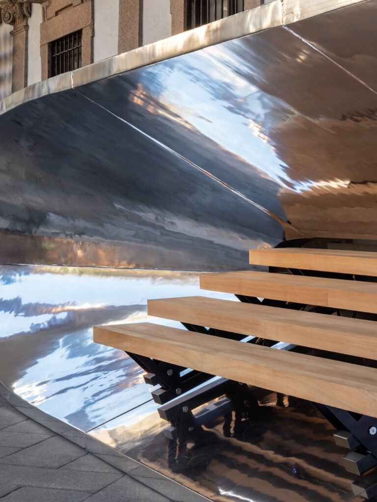 This installation is a big sculptural concave mirrored surface that respresent the flow of things, where change is evolution if at its center there is innovation.